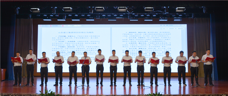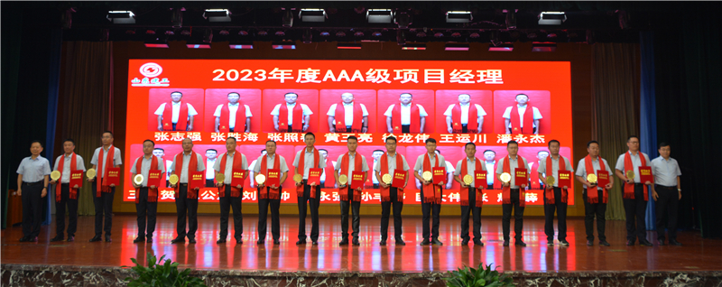 會議第二階段是表彰儀式,集團副董事長師厚紀宣讀表彰決定,集團領導分別為AAA級項目經理部、AAA級項目經理頒獎。AAA級項目經理集體誦讀《集團項目經理行為規范》。